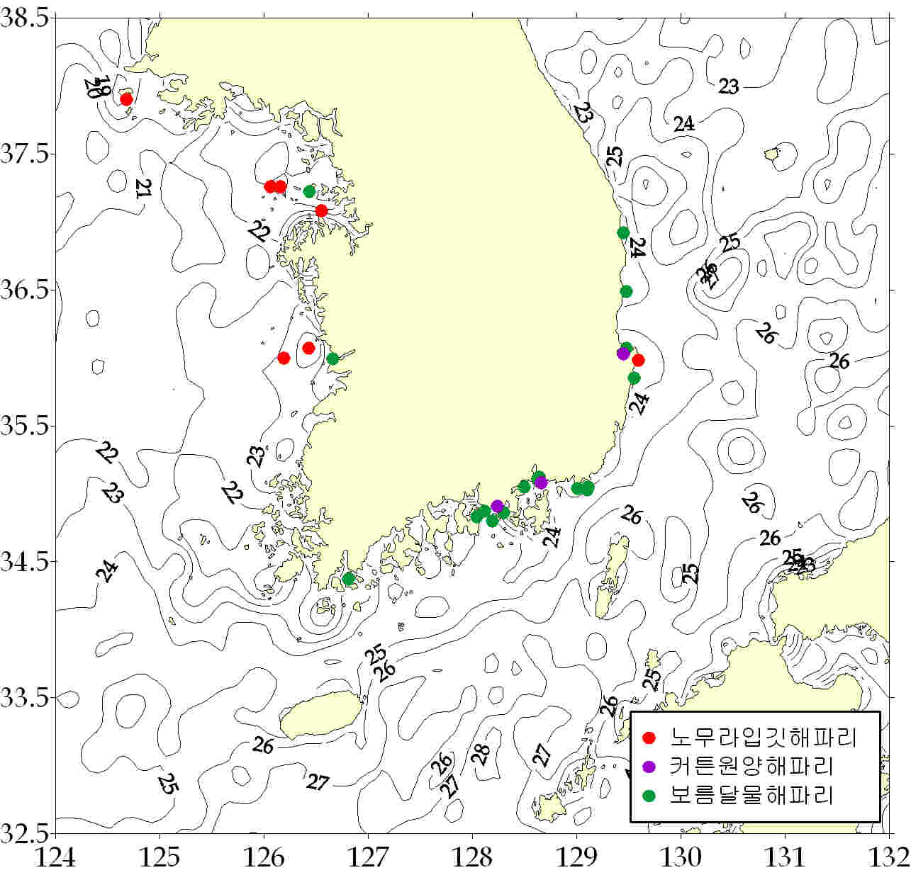 그림. 2011년 9월 16 ~ 9월 22일 한국 연안역 해파리 분포도. 해파리모니터링요원 및 지자체로부터 취합된 자료임. 등온선은 위성관측 표층수온을 가리킴.