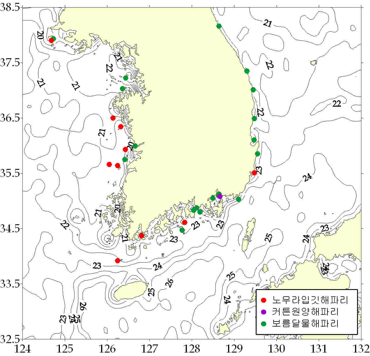 그림. 2011년 9월 23 ~ 9월 29일 한국 연안역 해파리 분포도. 해파리모니터링요원 및 지자체로부터 취합된 자료임. 등온선은 위성관측 표층수온을 가리킴.