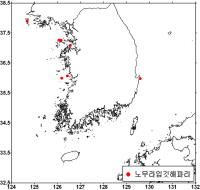 해파리 모니터링 주간보고(2011년 9월29일) - 9월23~9월29일 어업인 해파리모니터링요원 및 지자체로부터 취합/분석된 자료임 - (국립수산과학원 해파리대책반) < 주요 상황> □ 해파리 출현종 및 분포상황 ☞ 노무라입깃해파리 : 동/서/남해 일부해역 소량출현. ☞ 커튼원양해파리 : 남해 일부해역 소량출현. ☞ 보름달물해파리 : 동/서/남해 일부해역 소량출현. ○ 노무라입깃해파리 - 전북 근해 3곳, 충남/전남 근해 각 2곳, 제주/울산/인천 근해 각 1곳에서 총 25개체 미만 출현. - 출현 수온: 평균 21.12℃(범위: 16.85∼23.26℃) - 주간별 변동: 9/15(3.2%) → 9/22(4.1%) → 9/29(6.7%) ○ 커튼원양해파리 - 경남 일부해역 5개체 미만의 소량출현 - 출현 수온: 평균 21.65℃(범위: 21.65∼21.65℃) - 주간별 변동: 9/15(1.9%) → 9/22(1.7%) → 9/29(0.67%) ○ 보름달물해파리(독성이 매우 약한 종임.) - 동/서/남해 일부해역에서 소량출현. - 출현 수온: 평균 21.38℃(범위: 16.86∼23.15℃) - 주간별 변동: 9/15(15.8%) → 9/22(10%) → 9/29(12.8%) ※ 1. 수온은 9.23∼9.29일의 위성으로 관측된 표층수온 자료를 합성한 것으로부터 추출한 값임 2. 주간별 변동률은 주별 “해파리 출현/전체 응답자”를 백분율화한 값으로 대량출현의 판단근거로는 이용될 수 없음 □ 조치사항 ○ 보름달물해파리가 남해 일부지역 소량 밀집 출현하므로 조업시 주의 요망 ○ 노무라입깃해파리의 지속적인 집중감시 필요 ○ 노무라입깃해파리와 커튼원양해파리는 맹독성으로 피부접촉 주의요망 □ 금후전망 ○ 보름달물해파리가 전국연안에서 출현지속 후 감소 ○ 노무라입깃해파리가 연근해 일부해역에서 출현 지속 각 지역별 해파리 출현률(%)