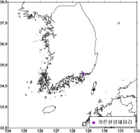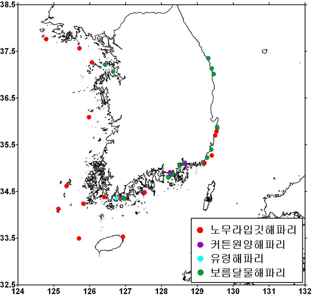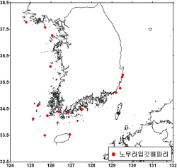 그림. 2011년 10월 7 ~ 10월 13일 한국 연안역 해파리 분포도. 해파리모니터링요원 및 지자체로부터 취합된 자료임.