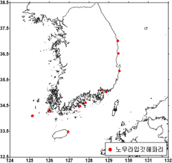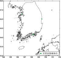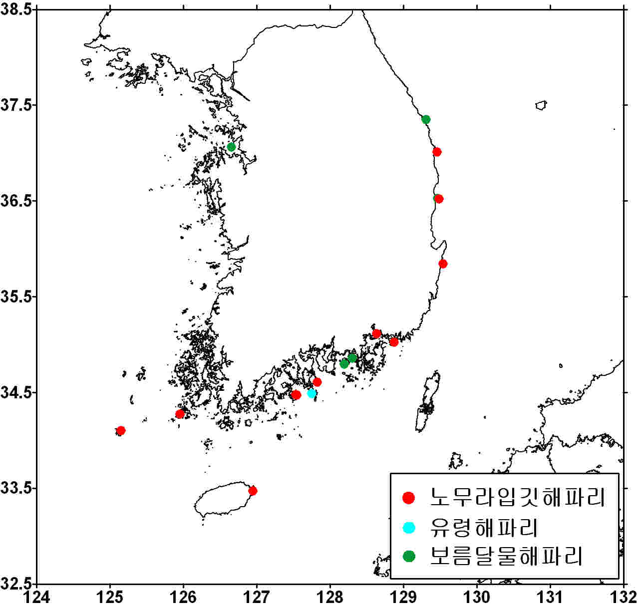 그림. 2011년 11월 25 ~ 12월 1일 한국 연안역 해파리 분포도. 해파리 모니터링요원 및 지자체로부터 취합된 자료임.