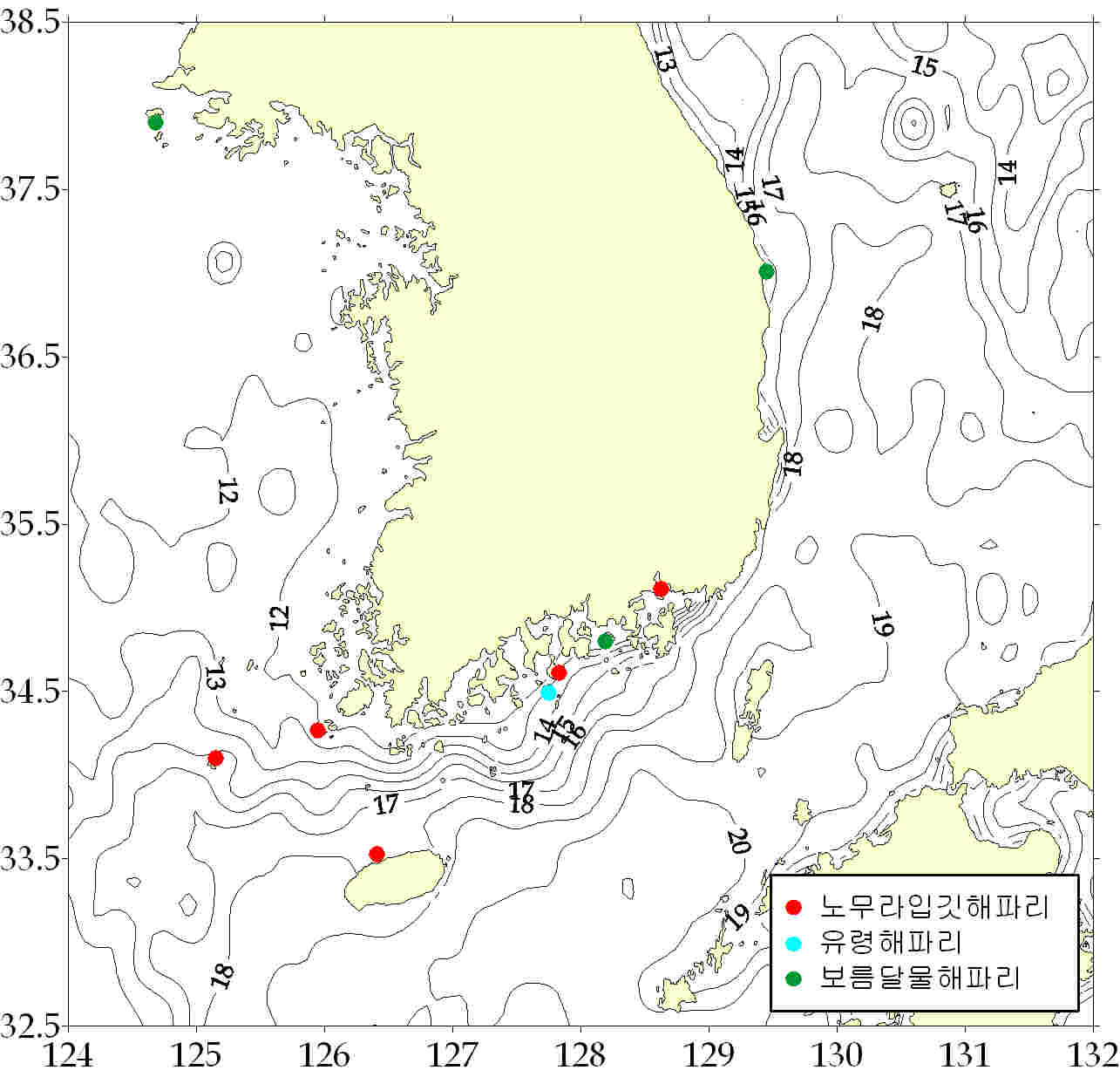 그림. 2011년 12월 9 ~ 12월 15일 한국 연안역 해파리 분포도. 해파리 모니터링요원 및 지자체로부터 취합된 자료임. 등온선은 위성관측 표층수온을 가리킴.