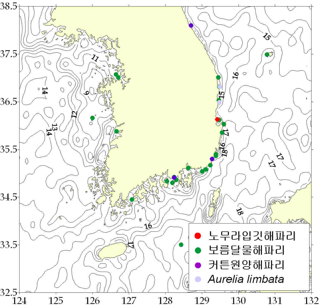 그림. 2012년 5월 11 ~ 17일 한국 연안역 해파리 분포도. 해파리 모니터링요원 및 지자체로부터 취합된 자료임. 등온선은 위성관측 표층수온을 가리킴.