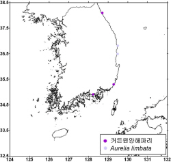 해파리 모니터링 주간보고(2012년5월17일) - 5.11~5.17일 어업인 해파리모니터링요원의 취합/분석 자료임 - (국립수산과학원 해파리대책반) < 주요 상황> ☞ 노무라입깃해파리 : 동해 일부해역 소량출현. ☞ 보름달물해파리 : 동/서/남해, 대한해협 일부해역 소량출현. ☞ 커튼원양해파리 : 동/남해 일부해역 소량출현. ☞ Aurelia limbata : 동해 일부해역 소량출현. □ 해파리 출현종 및 분포상황 ○ 노무라입깃해파리 - 경북 근해 1곳에서 1~3마리 출현. - 출현 수온: 평균 14.28℃(범위: 14.28 ~ 14.28℃) - 주간별 변동: 5/3(1.4%) → 5/10(0.59%) → 5/17(0.67%) ○ 보름달물해파리(독성이 매우 약한 종임.) - 경북 근해 7곳, 경남 근해 5곳, 부산 근해 4곳, 충남/울산 근해 각 2곳, 경기/전북/전남(남) 근해 각 1곳에서 소량 출현. - 출현 수온: 평균 14.31℃(범위: 8.43 ~ 18.48℃) - 주간별 변동: 5/3(8.2%) → 5/10(7.1%) → 5/17(15.5%) ○ 커튼원양해파리 - 경남/부산/강원도 근해 각 1곳에서 소량출현. - 출현 수온: 평균 14.86℃(범위: 13.56 ~ 16.17℃) - 주간별 변동: 5/17(2.0%) ○ Aurelia limbata - 경북 근해 2곳에서 소량출현. - 출현 수온: 평균 15.74℃(범위: 15.15 ~ 16.33℃) - 주간별 변동: 5/3(0.68%) → 5/10(0.59%) → 5/17(1.4%) ※ 1. 수온은 5.11∼5.17일의 위성으로 관측된 표층수온 자료를 합성한 것으로부터 추출한 값임 2. 주간별 변동률은 주별 “해파리 출현/전체 응답자”를 백분율화한 값으로 대량출현의 판단근거로는 이용될 수 없음 □ 조치사항 ○ 노무라입깃해파리의 집중감시 필요 □ 금후전망 ○ 노무라입깃해파리 연근해 일부해역 소량출현 지속 ○ 보름달물해파리 출현증가 각 지역별 해파리 출현률(%)