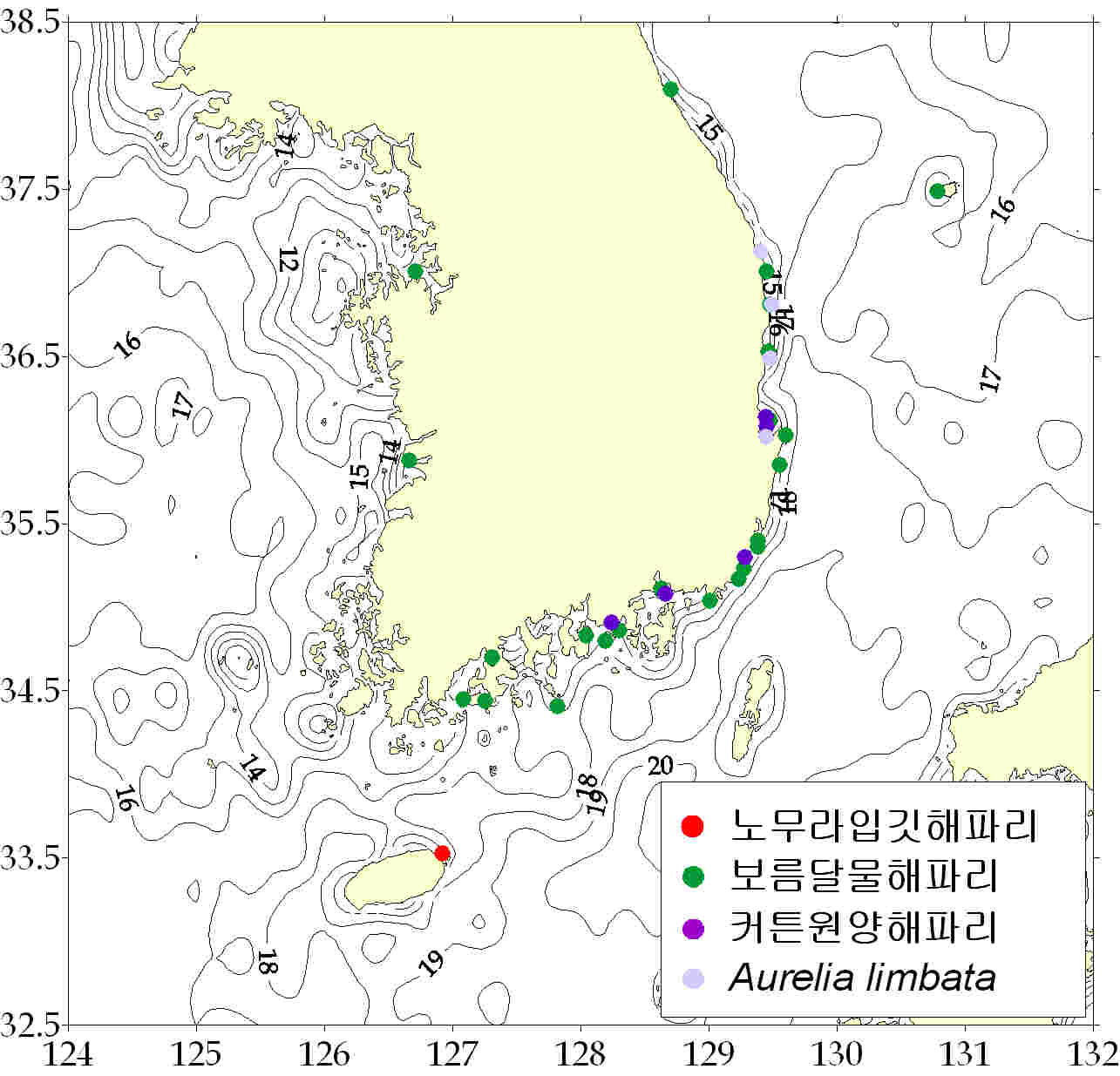 그림. 2012년 5월 18 ~ 24일 한국 연안역 해파리 분포도. 해파리 모니터링요원 및 지자체로부터 취합된 자료임. 등온선은 위성관측 표층수온을 가리킴.