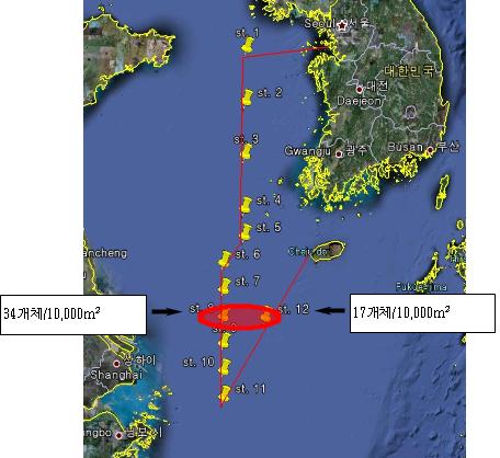 <노무라입깃해파리 유체 채집정점 및 밀도> |