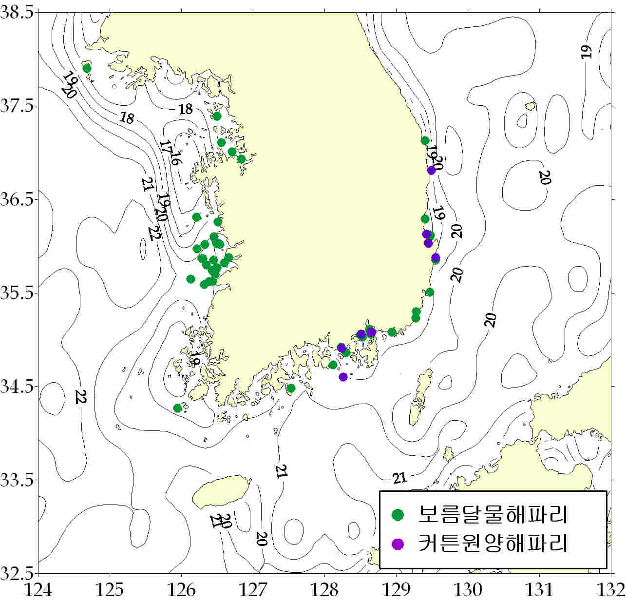 그림. 2012년 6월 15 ~ 21일 한국 연안역 해파리 분포도. 해파리 모니터링요원 및 지자체로부터 취합된 자료임. 등온선은 위성관측 표층수온을 가리킴.
