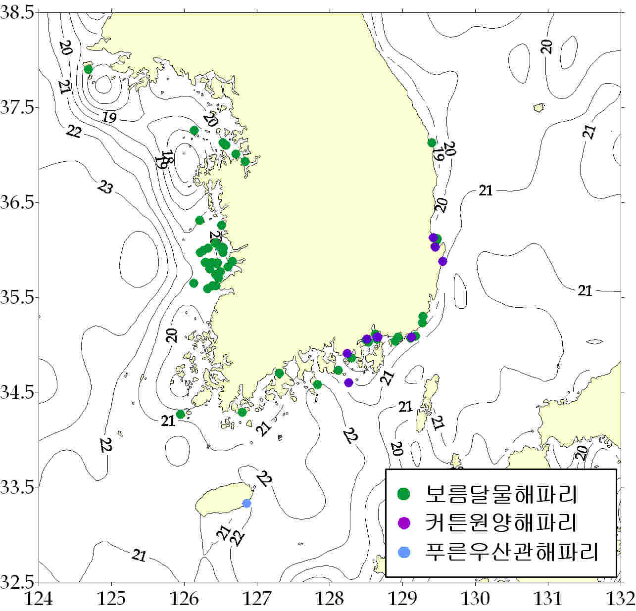 그림. 2012년 6월 22 ~ 28일 한국 연안역 해파리 분포도. 해파리 모니터링요원 및 지자체로부터 취합된 자료임. 등온선은 위성관측 표층수온을 가리킴.