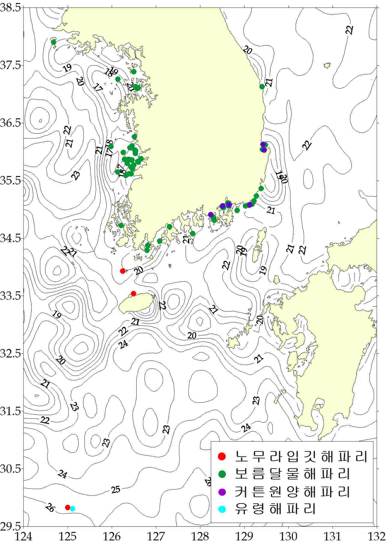 그림. 2012년 6월 29 ~ 7월 5일 한국 연안역 해파리 분포도. 해파리 모니터링요원 및 지자체/해양경찰청으로부터 취합된 자료임. 등온선은 위성관측 표층수온을 가리킴.