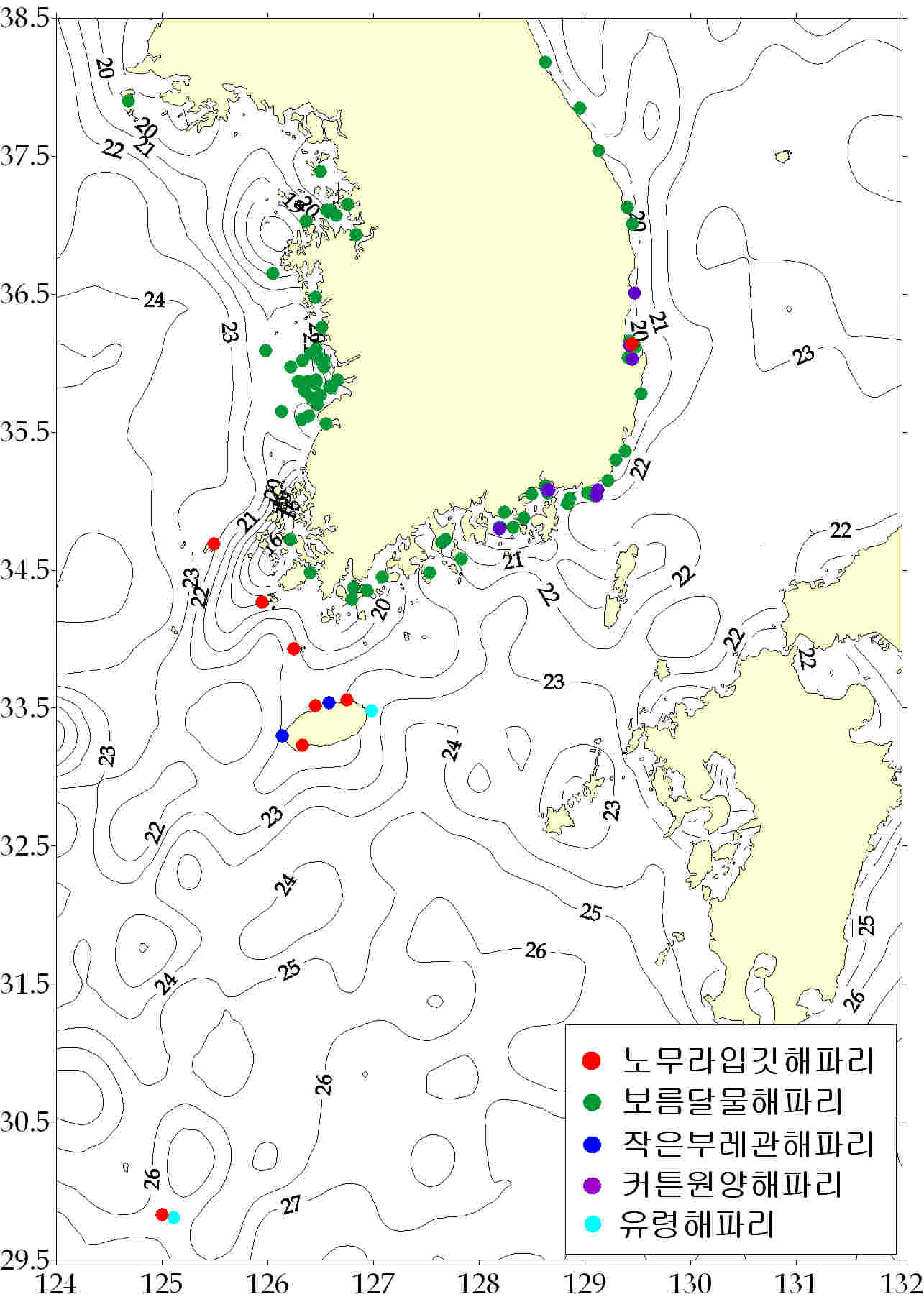 그림. 2012년 7월 6 ~ 7월 12일 한국 연안역 해파리 분포도. 해파리 모니터링요원 및 지자체/해양경찰청으로부터 취합된 자료임. 등온선은 위성관측 표층수온을 가리킴.