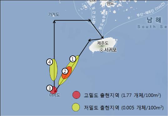 그림1. <항공예찰 경로 및 노무라입깃해파리 출현밀도 (단위: 개체/100m2)> 해역별 노무라입깃해파리 출현밀도 (개체/100m2)