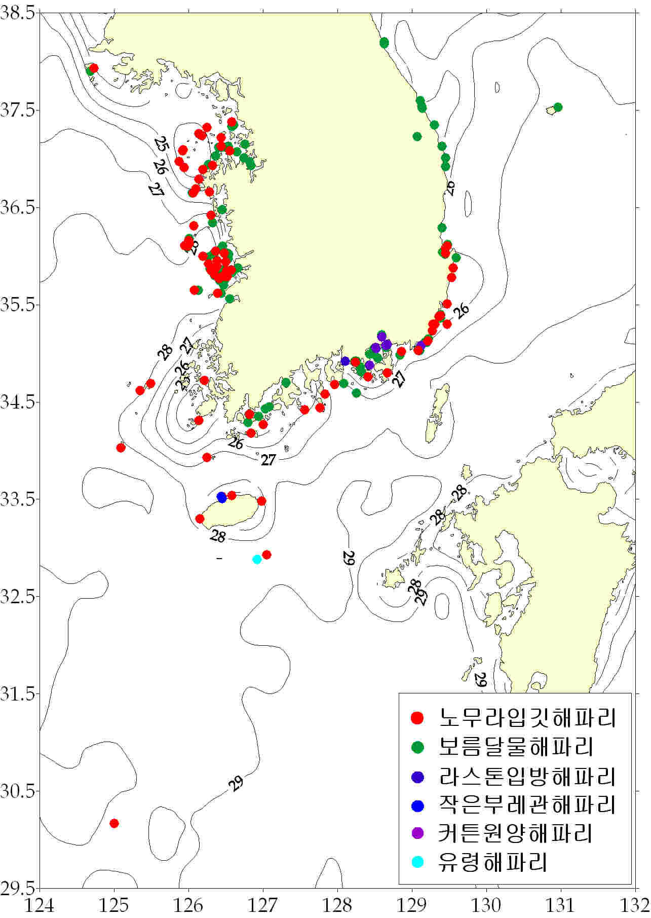 그림. 2012년 7월 27 ~ 8월 2일 한국 연안역 해파리 분포도. 해파리 모니터링요원 및 지자체/해양경찰청으로부터 취합된 자료임. 등온선은 위성관측 표층수온을 가리킴.