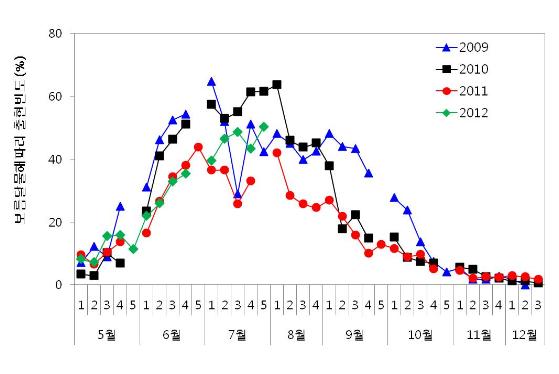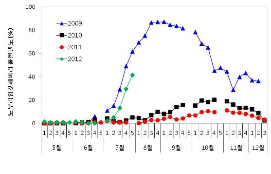 보름달물해파리와 노무라입깃해파리의 출현빈도 (2009~2012)