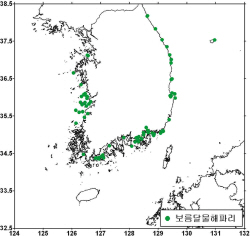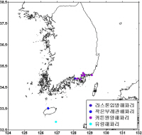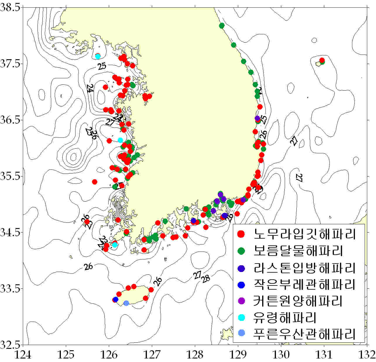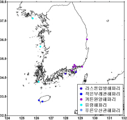 해파리 모니터링 주간보고(2012년8월16일) - 8.10~8.16일 어업인 해파리모니터링요원 및 해양경찰청 협조로 취합/분석 자료임 - (국립수산과학원 해파리대책반) < 주요 상황> ☞ 노무라입깃해파리 : 동/서/남해, 제주도 전해역 출현. ☞ 보름달물해파리 : 동/서/남해 전해역 출현. ☞ 라스톤입방해파리 : 경남 일부해역 출현. ☞ 작은부레관해파리 : 제주도 일부해역 출현. □ 해파리 출현종 및 분포상황 ○ 노무라입깃해파리(강독성) - 전북 연근해 등 104곳에서 출현. 제주도/인천/충남/전남(서)/전남(남)/전북/울산 일부지역 밀집출현. - 출현 수온: 평균 25.96℃(범위: 20.79 ~ 29.82℃) - 출현률: 8/2(41.3%) → 8/9(53.5%) → 8/16(54.7%) ○ 보름달물해파리(약독성) - 전북 연근해 등 78곳에서 출현. 전북/경남 연안역 일부지역 밀집출현. - 출현 수온: 평균 26.34℃(범위: 22.44 ~ 29.26℃) - 출현률: 8/2(50.3%) → 8/9(48.7%) → 8/16(41.1%) ○ 라스톤입방해파리(맹독성) - 경남 연근해 등 3곳에서 출현. - 출현률: 8/16(1.6%) ○ 작은부레관해파리(맹독성) - 제주도 연근해 등 2곳에서 출현. - 출현률: 8/16(1.1%) ○ 커튼원양해파리(강독성) - 경남 연근해 등 8곳에서 소량출현. - 출현 수온: 평균 27.09℃(범위: 24.99 ~ 28.14℃) - 출현률: 8/2(4.1%) → 8/9(3.7%) → 8/16(4.2%) ○ 유령해파리(강독성) - 인천/전북/전남(서) 연근해 3곳에서 출현. - 출현 수온: 평균 26.45℃(범위: 23.32 ~ 29.40℃) - 출현률: 8/2(0.52%) → 8/9(1.1%) → 8/16(1.6%) ○ 푸른우산관해파리(약독성) - 제주도 연근해 1곳에서 출현. - 출현률: 8/16(0.53%) ※ 1. 수온은 8.10∼8.16일의 위성으로 관측된 표층수온 자료를 합성한 것으로부터 추출한 값임. 2. 출현율은 이번주 전체응답자(190명) 중 해파리를 관찰한 사람수를 백분율화한 값으로 대량출현의 판단근거로는 이용될 수 없음. □ 조치사항 ○ 노무라입깃해파리 및 보름달물해파리의 집중감시 필요. ○ 노무라입깃해파리, 유령해파리, 커튼원양해파리, 작은부레관해파리, 라스톤입방해파리는 독성이 강하므로 피부접촉을 주의하여야 함. □ 금후전망 ○ 보름달물해파리 및 노무라입깃해파리의 출현증가. 각 지역별 해파리 출현률(%)