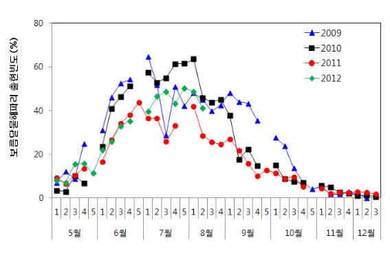 보름달물해파리와 노무라입깃해파리의 출현빈도 (2009~2012)