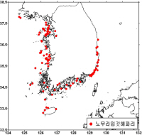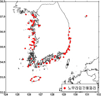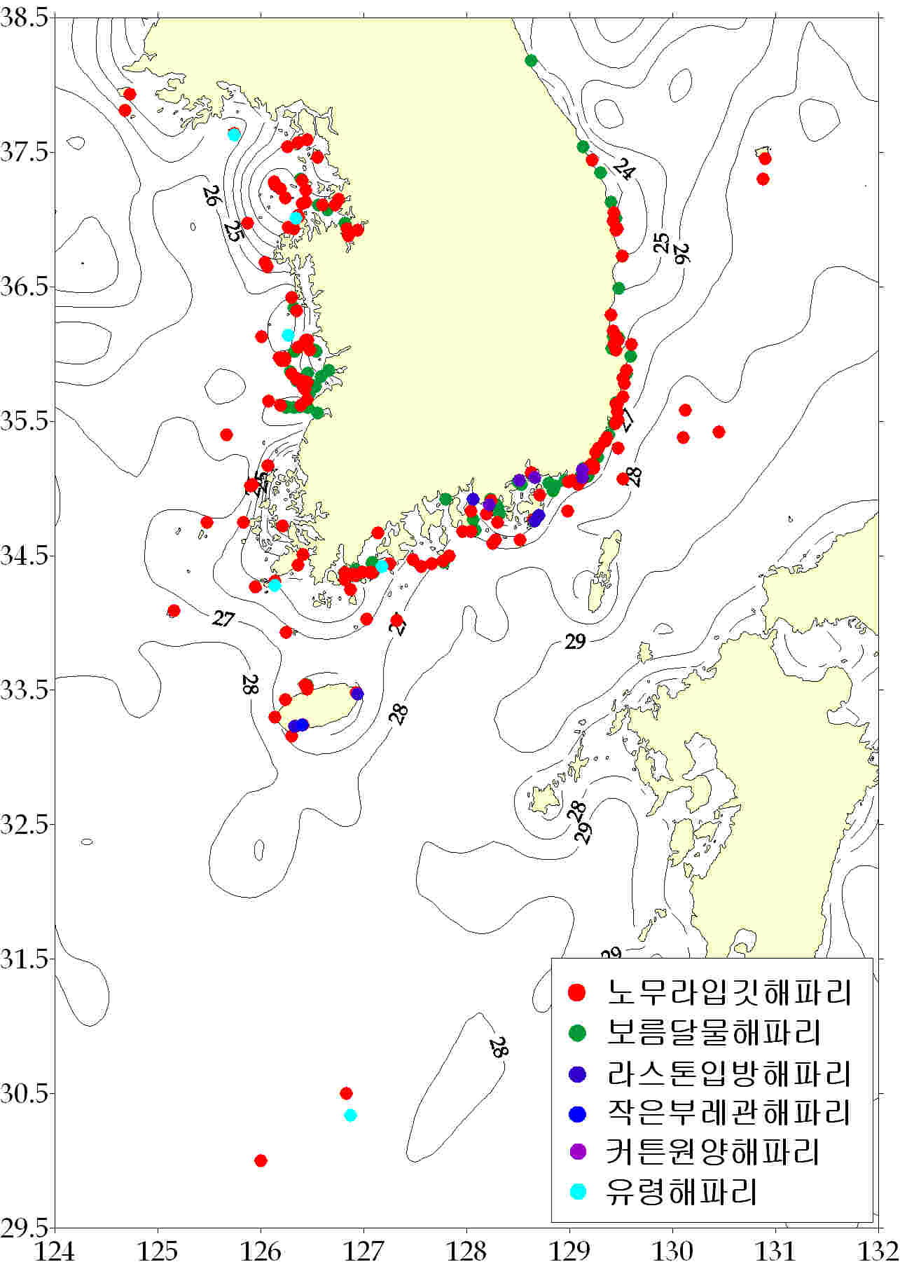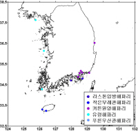 해파리 모니터링 주간보고(2012년8월23일) - 8.17~8.23일 어업인 해파리모니터링요원 및 해양경찰청 협조로 취합/분석 자료임 - (국립수산과학원 해파리대책반) < 주요 상황> ☞ 노무라입깃해파리 : 동/서/남해, 제주도, 동중국해 전해역 출현. ☞ 보름달물해파리 : 동/서/남해, 제주도 전해역 출현. ☞ 라스톤입방해파리 : 경남, 제주도 일부해역 출현. ☞ 작은부레관해파리 : 제주도 일부해역 출현. □ 해파리 출현종 및 분포상황 ○ 노무라입깃해파리(강독성) - 전북 연근해 등 152곳에서 출현. 제주도/인천/충남/전남(서)/전남(남)/전북/울산 일부지역 밀집출현. - 출현 수온: 평균 24.75℃(범위: 18.48 ~ 28.58℃) - 출현률: 8/9(53.5%) → 8/16(54.7%) → 8/23(68.4%) ○ 보름달물해파리(약독성) - 전북 연근해 등 79곳에서 출현. 전북/경남 연안역 일부지역 밀집출현. - 출현 수온: 평균 25.18℃(범위: 18.34 ~ 28.00℃) - 출현률: 8/9(48.7%) → 8/16(41.1%) → 8/23(35.4%) ○ 라스톤입방해파리(맹독성) - 경남/제주도 연근해 등 5곳에서 출현. - 출현 수온: 평균 24.69℃(범위: 23.34 ~ 25.99℃) - 출현률: 8/16(1.6%) → 8/23(2.3%) ○ 작은부레관해파리(맹독성) - 제주도 연근해 등 1곳에서 출현. - 출현률: 8/16(1.1%) → 8/23(0.45%) ○ 커튼원양해파리(강독성) - 경남/부산/제주도 연근해 등 8곳에서 소량출현. - 출현 수온: 평균 25.25℃(범위: 23.34 ~ 26.65℃) - 출현률: 8/9(3.7%) → 8/16(4.2%) → 8/23(3.6%) ○ 유령해파리(강독성) - 인천/충남/전북/전남(서)/전남(남)/동중국해 연근해 등 5곳에서 출현. - 출현 수온: 평균 24.96℃(범위: 22.61 ~ 28.68℃) - 출현률: 8/9(1.1%) → 8/16(1.6%) → 8/23(2.2%) ※ 1. 수온은 8.17∼8.23일의 위성으로 관측된 표층수온 자료를 합성한 것으로부터 추출한 값임. 2. 출현율은 이번주 전체응답자(225명) 중 해파리를 관찰한 사람수를 백분율화한 값으로 대량출현의 판단근거로는 이용될 수 없음. □ 조치사항 ○ 노무라입깃해파리의 집중감시 및 관계기관의 모니터링보고 ○ 노무라입깃해파리, 유령해파리, 커튼원양해파리, 작은부레관해파리는 독성이 강하므로 피부접촉을 주의하여야 함. ○ 라스톤입방해파리는 2∼3cm의 투명한 맹독성해파리로서 경남 남해군 미조항부터 거제 와현해수욕장까지 관계기관의 지속적인 모니터링과 즉각적인 수거작업이 필요한 종임. □ 금후전망 ○ 태풍 15호의 영향으로 외해 노무라입깃해파리의 연근해 유입이 예상되므로, 관련기관과 정치망 등 정치성어구 어업인의 각별한 주의가 필요함 각 지역별 해파리 출현률(%)
