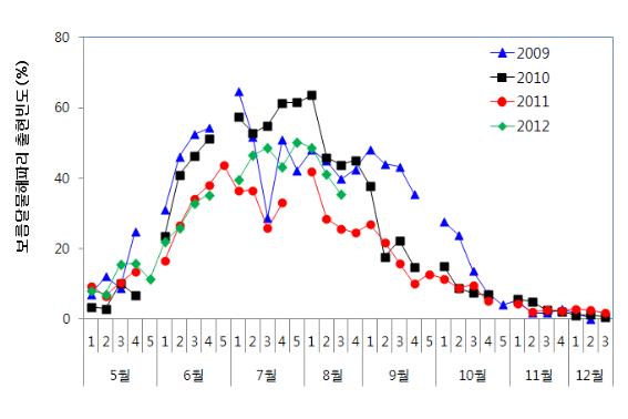 보름달물해파리와 노무라입깃해파리의 출현빈도 (2009 ~ 2012)