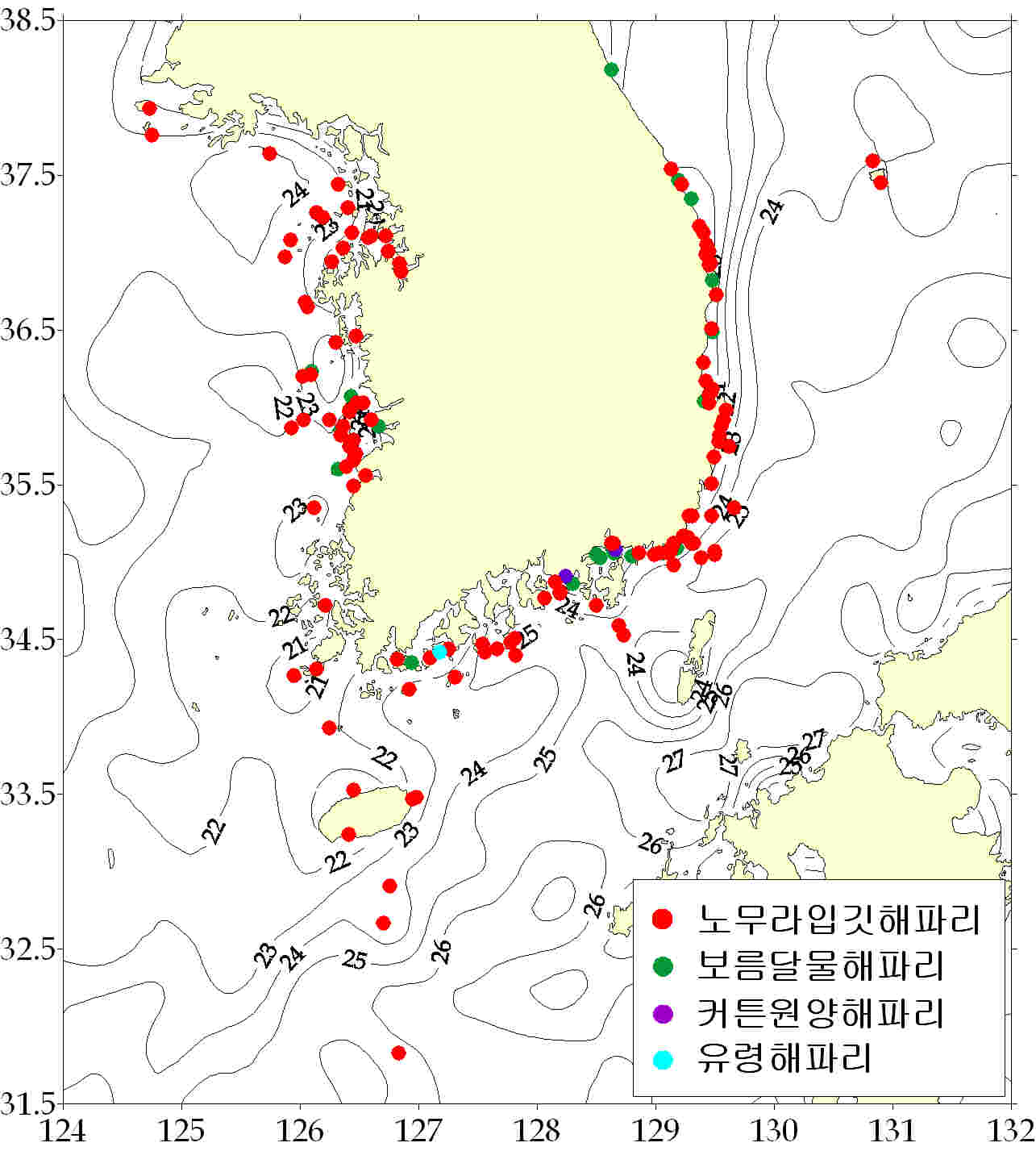그림. 2012년 9월 7 ~ 13일 한국 연안역 해파리 분포도. 해파리 모니터링요원 및 지자체/해양경찰청으로부터 취합된 자료임. 등온선은 위성관측 표충수온을 가리킴.