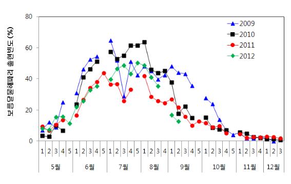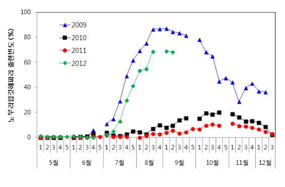 보름달물해파리와 노무라입깃해파리의 출현빈도('09 ~ '12.9.13)