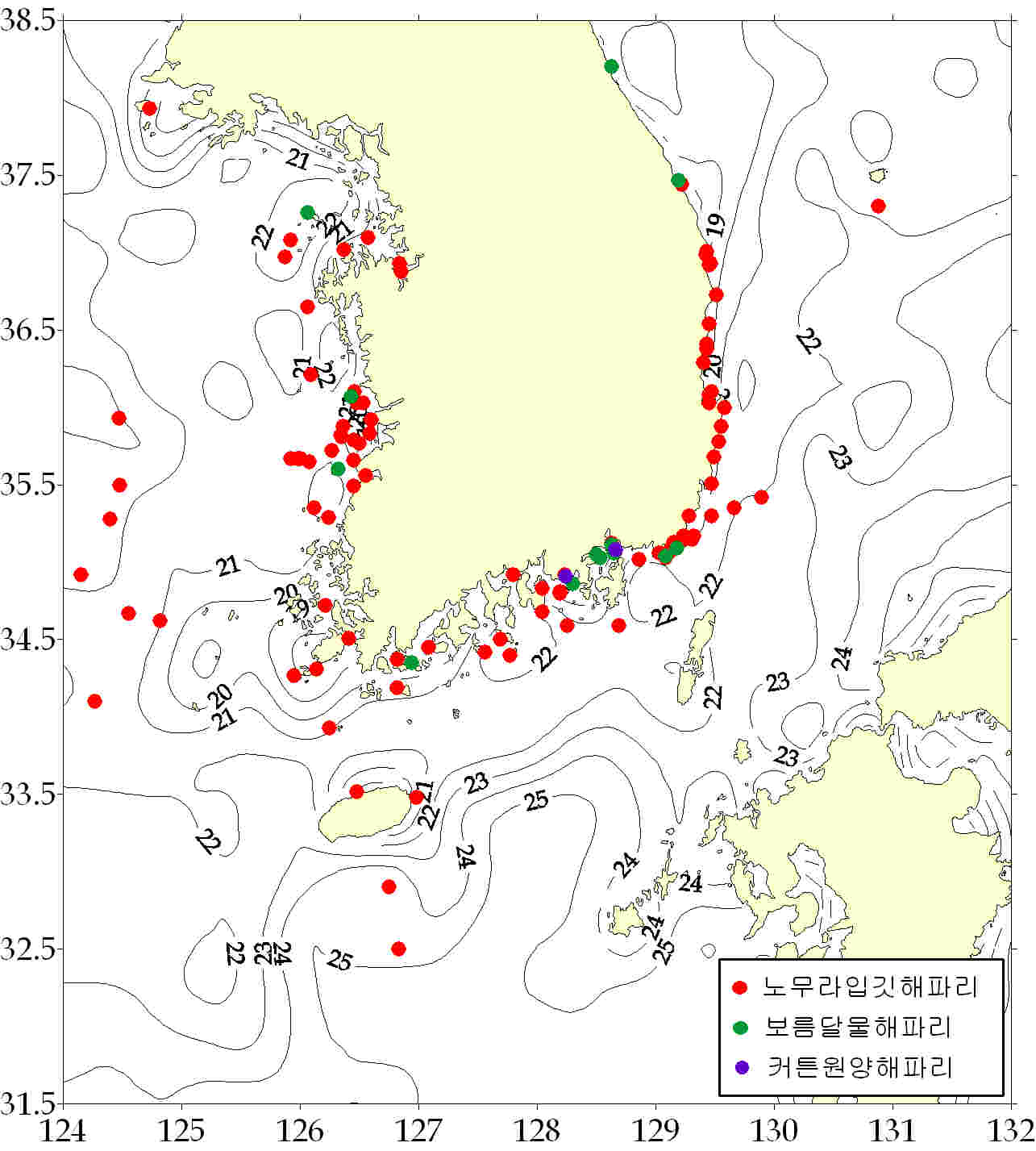 그림. 2012년 9월 21 ~ 27일 한국 연안역 해파리 분포도. 해파리 모니터링요원 및 지자체/해양경찰청으로부터 취합된 자료임. 등온선은 위성관측 표층수온을 가리킴.