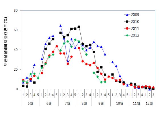 보름달물해파리와 노무라입깃해파리의 출현빈도 ('09 ~ '12.09.27)