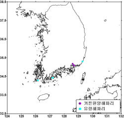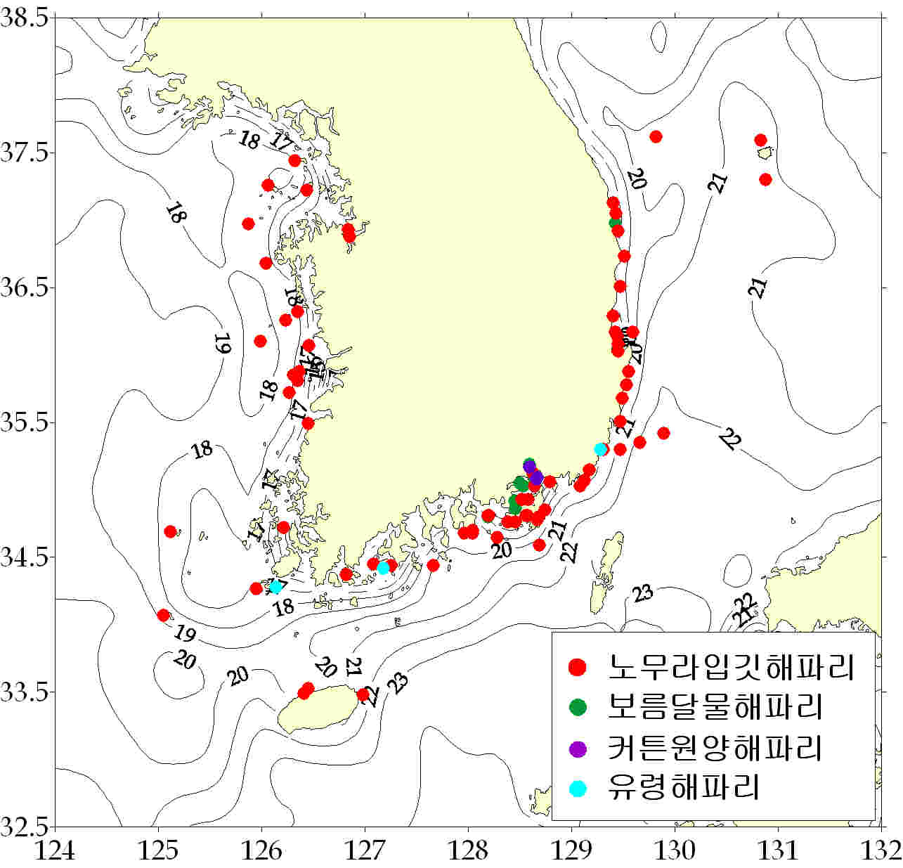해파리 모니터링 주간보고(2012년10월25일) - 10.19~10.25일 어업인 해파리모니터링요원, 지자체, 수협중앙회 및 해양경찰청 협조로 취합/분석 자료임 - (국립수산과학원 해파리대책반) < 주요 상황> ☞ 노무라입깃해파리 : 동/서/남해, 제주도 전해역 출현. ☞ 보름달물해파리 : 동/남해 일부해역 출현. □ 해파리 출현종 및 분포상황 ○ 노무라입깃해파리(강독성) - 경북 연근해 등 75곳에서 출현. 전남(서해)/전남(남해)/울산/경북 일부지역 밀집출현 - 서해안 지역은 감소 - 출현 수온: 평균 18.89℃(범위: 16.13 ~ 22.12℃) - 출현률: 10/11(50.6%) → 10/18(50.3%) → 10/25(46.6%) ○ 보름달물해파리(약독성) - 경남 연근해 등 10곳에서 출현. - 출현 수온: 평균 17.54℃(범위: 12.81 ~ 19.83℃) - 출현률: 10/11(7.1%) → 10/18(12.4%) → 10/25(6.2%) ○ 커튼원양해파리(강독성) - 경남 연근해 3곳에서 소량출현 - 출현 수온: 평균 18.34℃(범위: 17.41 ~ 18.94℃) - 출현률: 10/11(1.3%) → 10/18(2.5%) → 10/25(1.9%) ○ 유령해파리(강독성) - 부산 연근해 등 3곳에서 소량출현 - 출현 수온: 평균 17.34℃(범위: 17.34 ~ 17.34℃) - 출현률: 10/11(2.6%) → 10/18(1.2%) → 10/25(1.9%) ※ 1. 수온은 10.19∼10.25일의 위성으로 관측된 표층수온 자료를 합성한 것으로부터 추출한 값임. 2. 출현율은 이번주 전체응답자(161명) 중 해파리를 관찰한 사람수를 백분율화한 값으로 대량출현의 판단근거로는 이용될 수 없음. □ 조치사항 ○ 노무라입깃해파리의 집중감시 및 관계기관의 모니터링보고. ○ 보름달물해파리는 자연소멸중이나 지역적인 밀집출현이 가능하므로 집중감시 필요. ○ 노무라입깃해파리, 커튼원양해파리, 유령해파리는 독성이 강하므로 피부접촉을 주의하여야 함. □ 금후전망 ○ 노무라입깃해파리은 서해안 지역에서 출현감소가 예상되나, 남해 및 동해 중남부해역은 현 출현율이 유지될 것으로 예측됨. ○ 해당지역의 어업피해가 예상되므로, 관련기관과 어업인의 각별한 주의 및 신속한 보고가 필요함. 출현 해파리 분포도