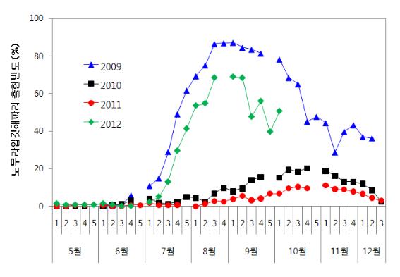 보름달물해파리와 노무라입깃해파리의 출현빈도 ('09~'12.10.25)