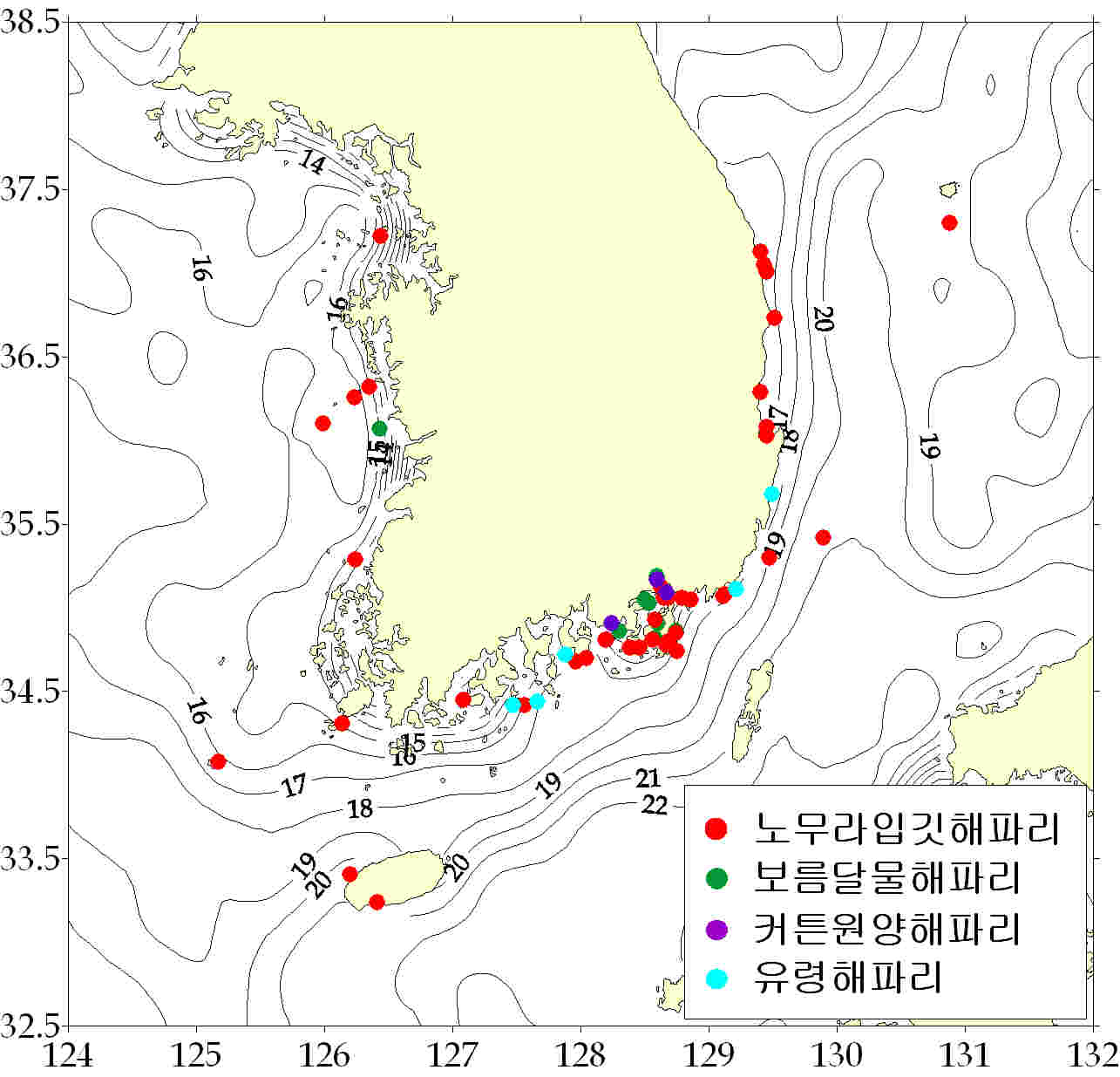 그림. 2012년 11월 2 ~ 8일 한국 연안역 해파리 분포도. 해파리 모니터링요원 및 지자체/해양경찰청으로부터 취합된 자료임. 등온선은 위성관측 표층수온을 가리킴.