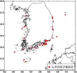 해파리 모니터링 주간보고(2012년11월8일) - 11.2~11.8일 어업인 해파리모니터링요원, 지자체, 수협중앙회 및 해양경찰청 협조로 취합/분석 자료임 - (국립수산과학원 해파리대책반) < 주요 상황> ☞ 노무라입깃해파리 : 동/서/남해, 제주도 전해역 출현. ☞ 보름달물해파리 : 서/남해 일부해역 출현. □ 해파리 출현종 및 분포상황 ○ 노무라입깃해파리(강독성) - 경남 연근해 등 41곳에서 출현. 전남(남해)/경남/울산 일부지역 밀집출현 - 출현 수온: 평균 16.58℃(범위: 14.11 ~ 21.54℃) - 출현률: 10/25(46.6%) → 11/1(36.4%) → 11/8(26.2%) ○ 보름달물해파리(약독성) - 경남 연근해 등 13곳에서 출현. 경남 일부지역 밀집출현 - 출현 수온: 평균 15.20℃(범위: 8.31 ~ 17.17℃) - 출현률: 10/25(6.2%) → 11/1(9.8%) → 11/8(8.3%) ○ 커튼원양해파리(강독성) - 경남 연근해 3곳에서 소량출현 - 출현 수온: 평균 14.85℃(범위: 11.15 ~ 16.70℃) - 출현률: 10/25(1.9%) → 11/1(1.7%) → 11/8(1.9%) ○ 유령해파리(강독성) - 전남(남해) 연근해 등 5곳에서 소량출현 - 출현 수온: 평균 17.32℃(범위: 16.72 ~ 17.92℃) - 출현률: 10/25(1.9%) → 11/1(4.0%) → 11/8(3.2%) ※ 1. 수온은 11.2∼11.8일의 위성으로 관측된 표층수온 자료를 합성한 것으로부터 추출한 값임. 2. 출현율은 이번주 전체응답자(157명) 중 해파리를 관찰한 사람수를 백분율화한 값으로 대량출현의 판단근거로는 이용될 수 없음. □ 조치사항 ○ 노무라입깃해파리의 집중감시 및 관계기관의 모니터링보고. ○ 보름달물해파리는 자연소멸중이나 지역적인 밀집출현이 가능하므로 집중감시 필요. ○ 노무라입깃해파리, 커튼원양해파리, 유령해파리는 독성이 강하므로 피부접촉을 주의하여야 함. □ 금후전망 ○ 노무라입깃해파리 출현율의 지속적인 감소가 예측됨. ○ 노무라입깃해파리 및 보름달물해파리의 지역적인 밀집출현 및 어업피해가 가능하므로, 관련기관과 어업인의 각별한 주의 및 신속한 보고가 필요함. 각 지역별 해파리 출현률(%)