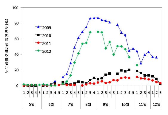 보름달물해파리와 노무라입깃해파리의 출현빈도('09~'12.11.08)