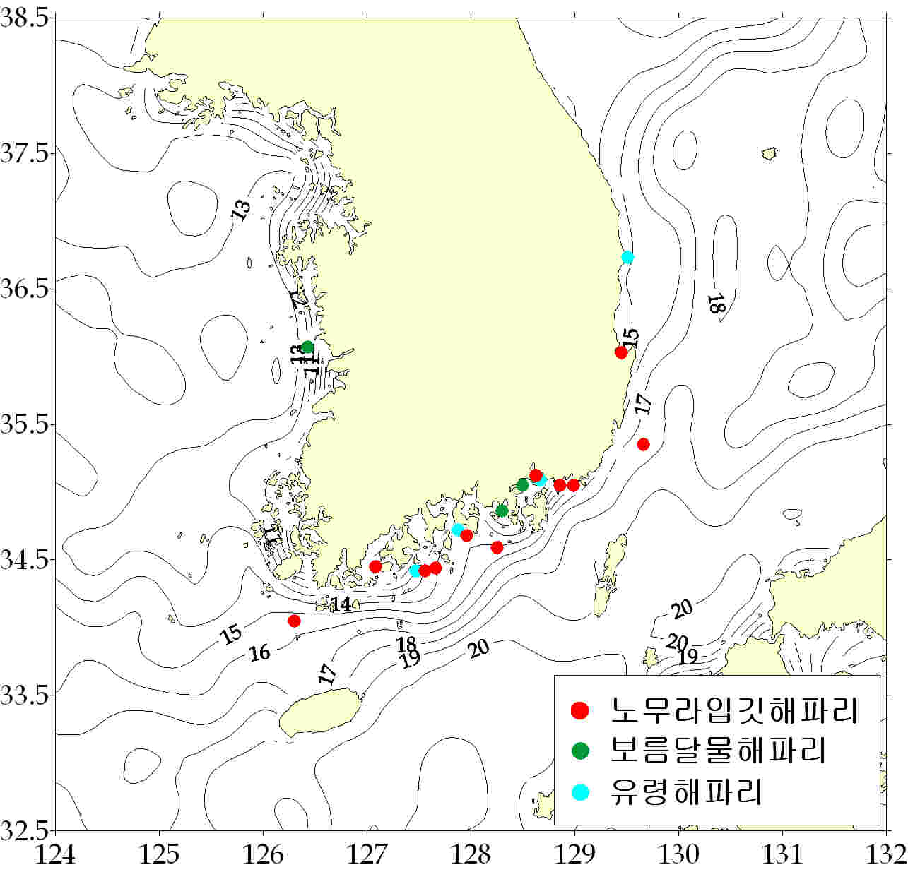 그림. 2012년 11월 16 ~ 22일 한국 연안역 해파리 분포도. 해파리 모니터링요원 및 지자체/해양경찰청으로붙터 취합된 자료임. 등온선은 위성관측 표층수온을 가리킴.