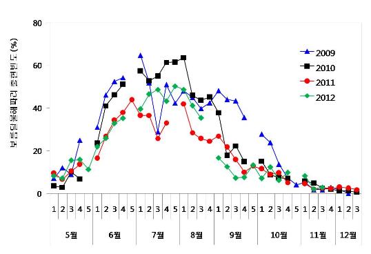 보름달물해파리와 노무라입깃해파리의 출현빈도 ('09~'12.11.22)