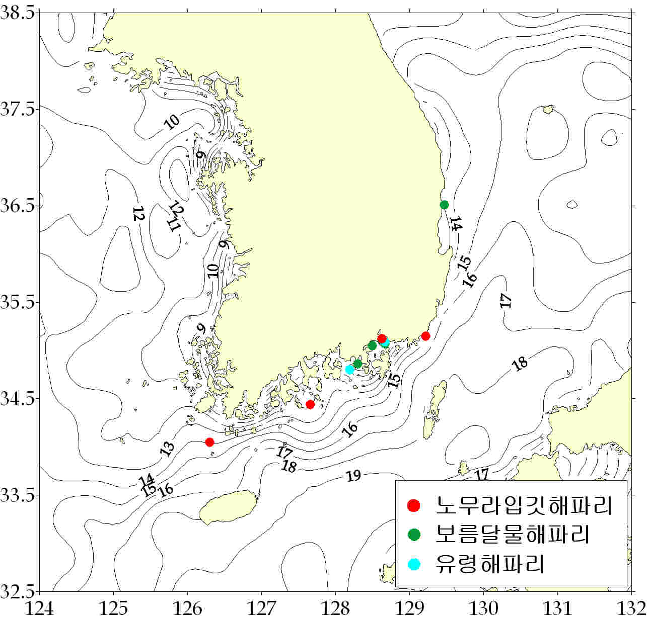 그림. 2012년 11월 30일 ~ 12월 6일 한국 연안역 해파리 분포도. 해파리 모니터링요원 및 지자체/해양경찰청으로부터 취합된 자료임. 등온선은 위성관측 표층수온을 가리킴.