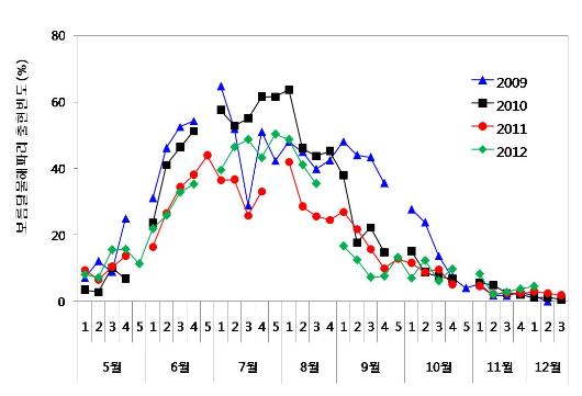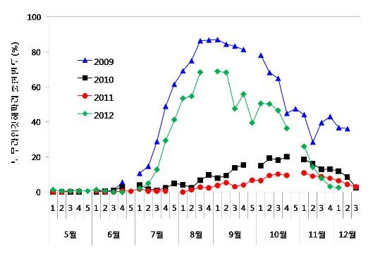 보름달물해파리와 노무라입깃해파리의 출현빈도 ('09 ~'12.12.06)