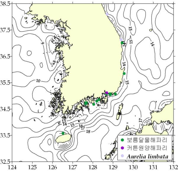 붙임: 출현 해파리 분포도 그림. 2013년 5월 6일 ~ 9일 한국 연안역 해파리 분포도. 해파리 모니터링요원으로부터 취합된 자료임. 등온선은 위성관측 표층수온을 가리킴.노무라입깃해파리 보름달물해파리 기타해파리