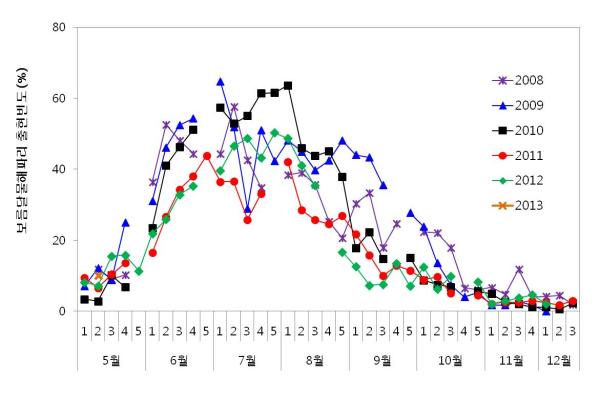 보름달물해파리와 노무라입깃해파리의 출현빈도 (‘08~’13.5.9) |