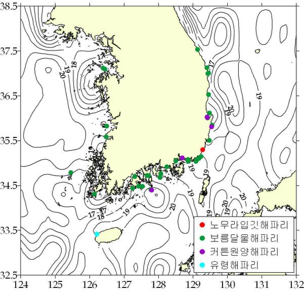 붙임 2. 금주 해파리 분포도 그림. 2013년 6월 6일 ~ 13일 한국 연안역 해파리 분포도. 해파리 모니터링요원으로부터 취합된 자료임. 등온선은 위성관측 표층수온을 가리킴.