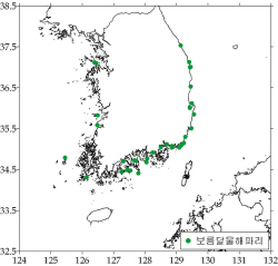 ○ 보름달물해파리(약독성) - 경북 연근해 등 35곳에서 출현. 전남(남해)/부산 일부해역(전남 가막만, 고흥, 부산 가덕도)에서 밀집출현 - 출현 수온: 평균 17.33℃(범위: 13.25 ~ 19.88℃) - 출현률: 5/30(8.3%) → 6/5(20.4%) → 6/13(25.7%)