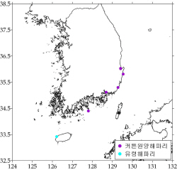 ○ 커튼원양해파리(강독성) - 경북 연근해 등 5곳에서 소량출현. - 출현 수온: 평균 18.70℃(범위: 18.56 ~ 18.83℃) - 출현률: 5/30(2.3%) → 6/5(4.4%) → 6/13(3.7%)