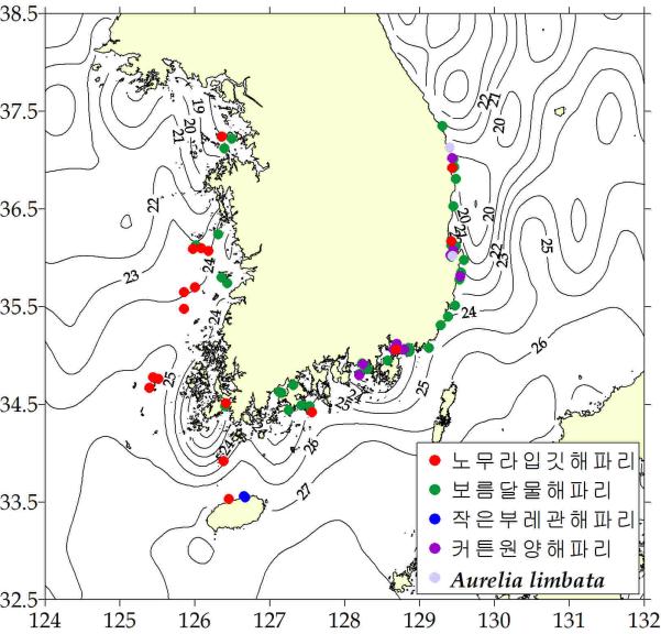 < 주요 상황> ☞ 노무라입깃해파리 : 동․서․남해 일부해역 소량 출현, 서해 남부 연근해역 밀집출현. ☞ 보름달물해파리 : 동․서해 일부해역, 남해 전해역 출현. ☞ 커튼원양해파리 : 동․남해 일부해역 출현. ☞ 작은부레관해파리 : 제주도 해역 출현. ☞ Aurelia limbata : 동해 중부해역 출현.