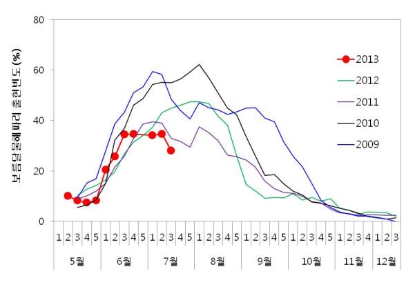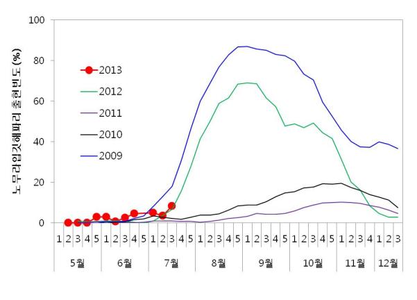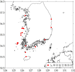 붙임 4. 노무라입깃해파리와 보름달물해파리의 출현빈도 연변동 |