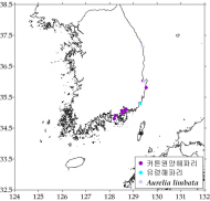 ○ Aurelia limbata(약독성) - 강원도 연근해 2곳에서 소량출현. - 수온: 평균 20.13℃(범위: 16.67 ~ 20.58℃) - 출현률: 7/4(1.2%) → 7/11(1.4%) → 7/18(1.5%)