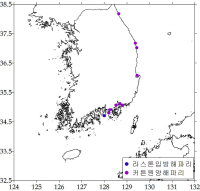 □ 해파리 출현종 및 분포상황 ○ 노무라입깃해파리(강독성) - 전북 연근해 등 58곳에서 출현. 전북/전남(서)/전남(남)/경남/부산/경북 일부해역에서 밀집출현 •전남 진도 서남해역/ 여수, 소리도 동남해역 •전북 무녀도, 어청도, 개야도 •경남 장승포 근해 •부산 기장 연근해 •경북 포항 근해 •제주도 추자도 인근해역 - 수온: 평균 25.80℃(범위: 22.20 ~ 29.44℃) - 출현률: 7/25(12.6%) → 8/1(27.5%) → 8/8(42.6%)