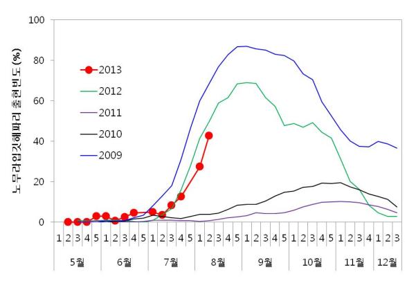 붙임 4. 노무라입깃해파리와 보름달물해파리의 출현빈도 연변동 <노무라입깃해파리><보름달물해파리> |
