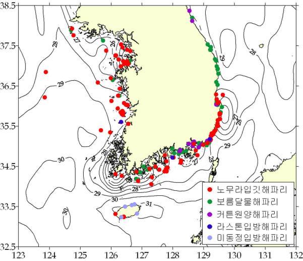 < 주요 상황> ☞ 노무라입깃해파리 : 동․서․남해 일부해역 소량 출현, 서해 중․남부/ 남해 서․남부/동해 중․남부 연근해역 밀집출현. ☞ 보름달물해파리 : 동․서해 일부해역, 남해 전해역 출현. ☞ 커튼원양해파리 : 동․남해 일부해역 출현. ☞ 라스톤입방해파리 : 서해 일부해역 소량 출현.