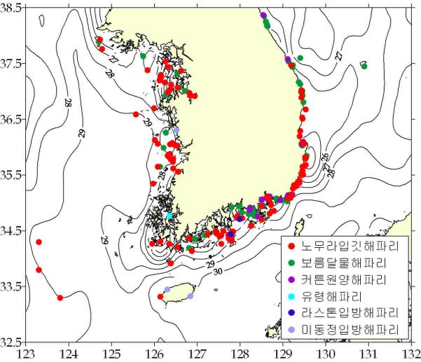 ○ 라스톤입방해파리(맹독성) - 전남 여수 소리도 연근해 1곳에서 출현. - 수온: 평균 26.72℃ - 출현률: 8/14(0.76%) → 8/22(0.70%) ※ 제주도 근해에서 미동정 입방해파리류 다수 발견.