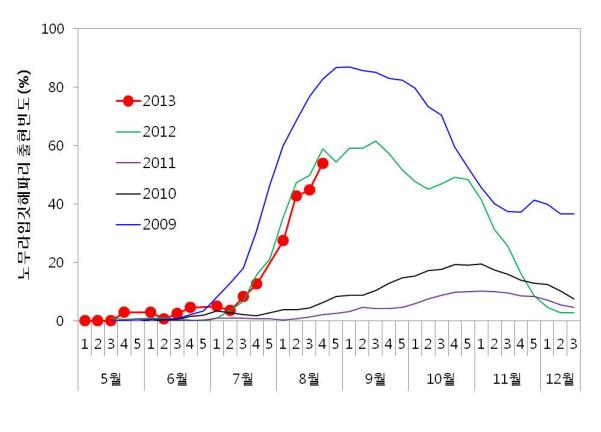 붙임 4. 노무라입깃해파리와 보름달물해파리의 출현빈도 연변동 <노무라입깃해파리><보름달물해파리> |