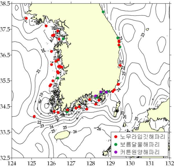 ☞ 노무라입깃해파리 : 동․서․남해 해역 출현, 서해 중․남부/ 남해 서․중부 연근해역 밀집출현. ☞ 보름달물해파리 : 동․서․남해 일부해역 출현. ☞ 커튼원양해파리 : 남해 일부해역 출현.
