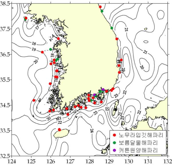 < 주요 상황> ☞ 노무라입깃해파리 : 동․서․남해 해역 출현, 서해 중․남부/ 남해 서․중부 연근해역 밀집출현. ☞ 보름달물해파리 : 동․서․남해 일부해역 출현. ☞ 커튼원양해파리 : 남해 일부해역 출현.