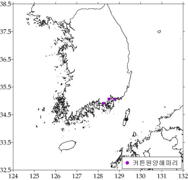 ○ 커튼원양해파리(강독성) - 경남 연근해 1곳에서 출현. •경남 진해시 행암만 연안 - 수온: 평균 20.48℃(범위: 19.84 ~ 21.11℃) - 출현률: 10/10(2.1%) → 10/18(0.79%) → 10/24(1.4%)